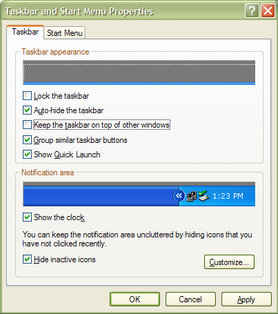 Right click on an area of the Window Taskbar > Select Properties